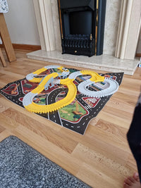 The track size varies depending on how it’s arranged. Fully extended, it stretches several feet long, making it ideal for both table-top and floor play areas.