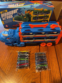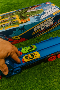 This set comes with the Dino Car Chomper Transporter and 4 metal alloy toy cars.