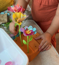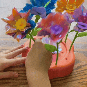 Children can arrange flowers into bouquets, place them in a vase, or show them off on a stand.