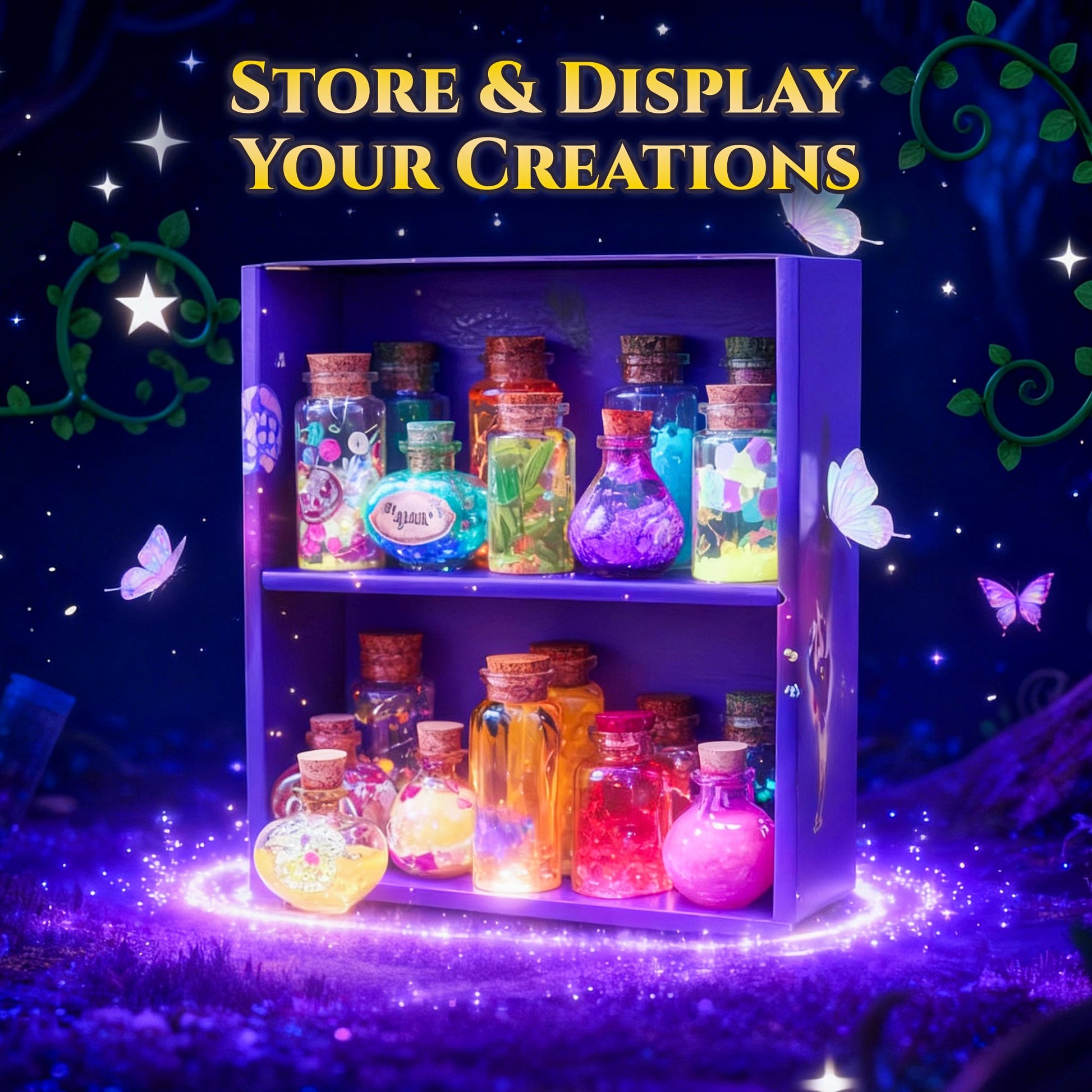 The kit includes a magic storage cabinet to hold and showcase the bottles, making it easy for kids to admire and organize their creations.