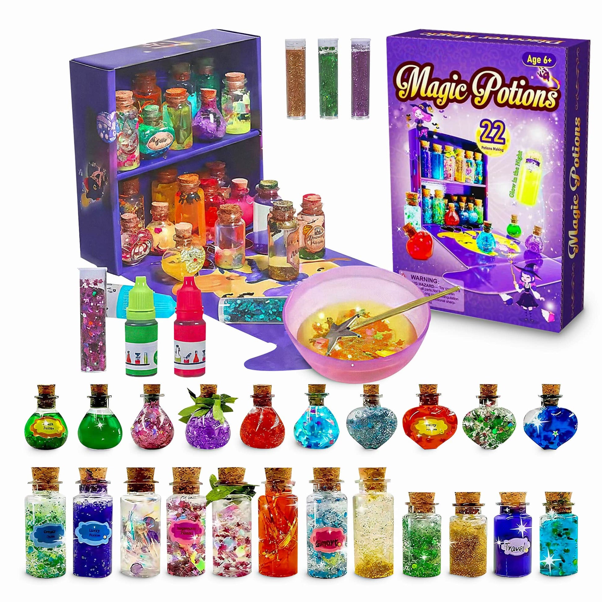 The kit includes enough materials to create up to 22 unique potions, each with different glitter, colors, and decorations.