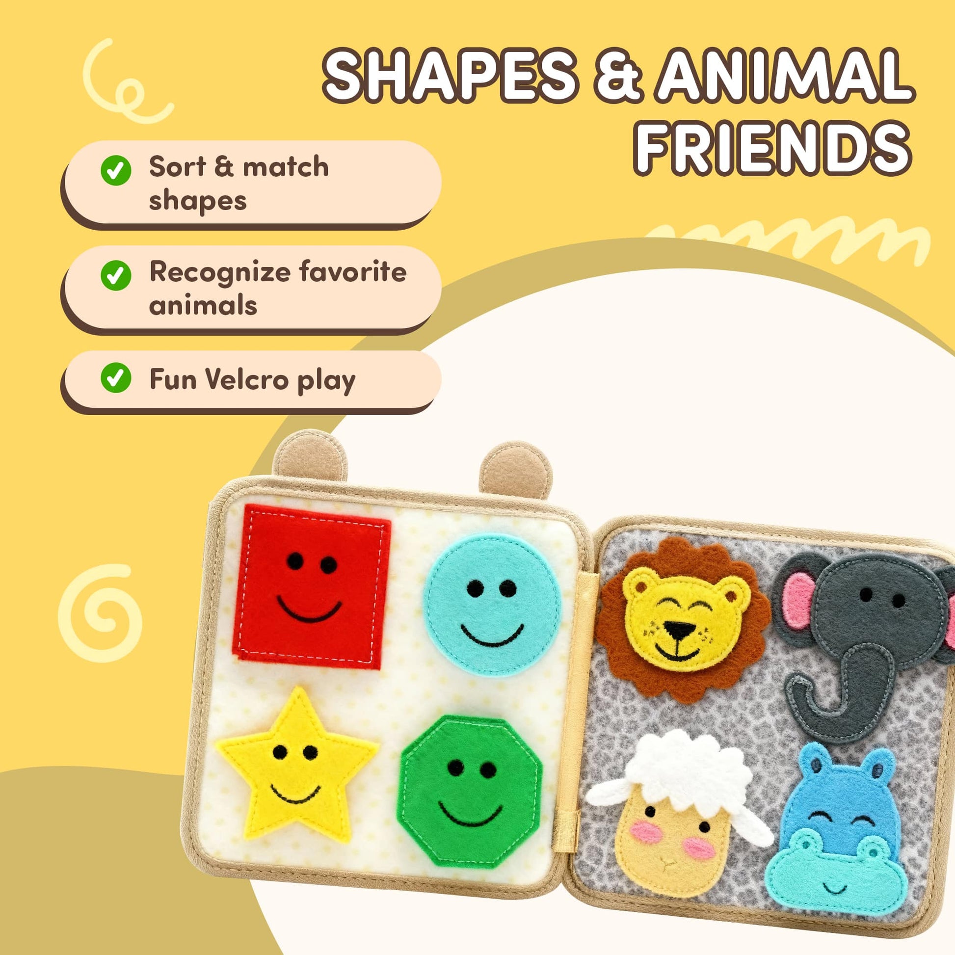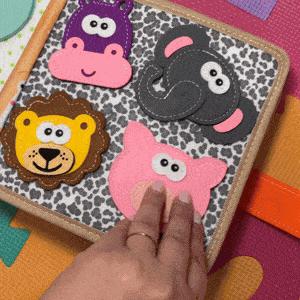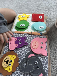 Match shapes, colors, and animals using the Velcro pieces.