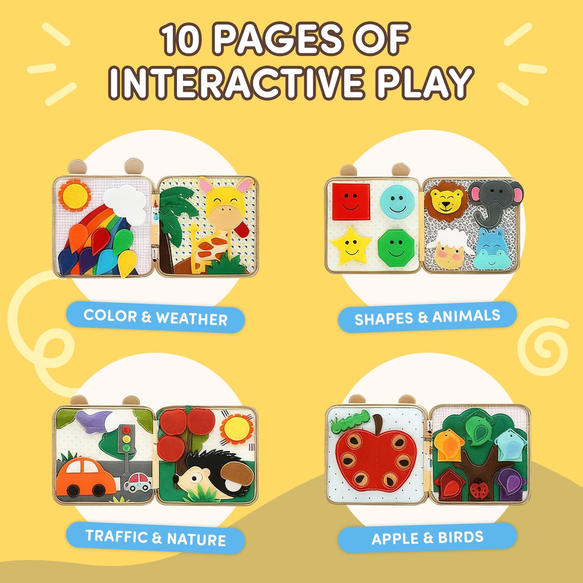 The book comes with 10 interactive pages, covering themes like colors & weather, shapes & animals, traffic & nature, counting, and more. Each page is designed to keep kids engaged while building developmental skills.