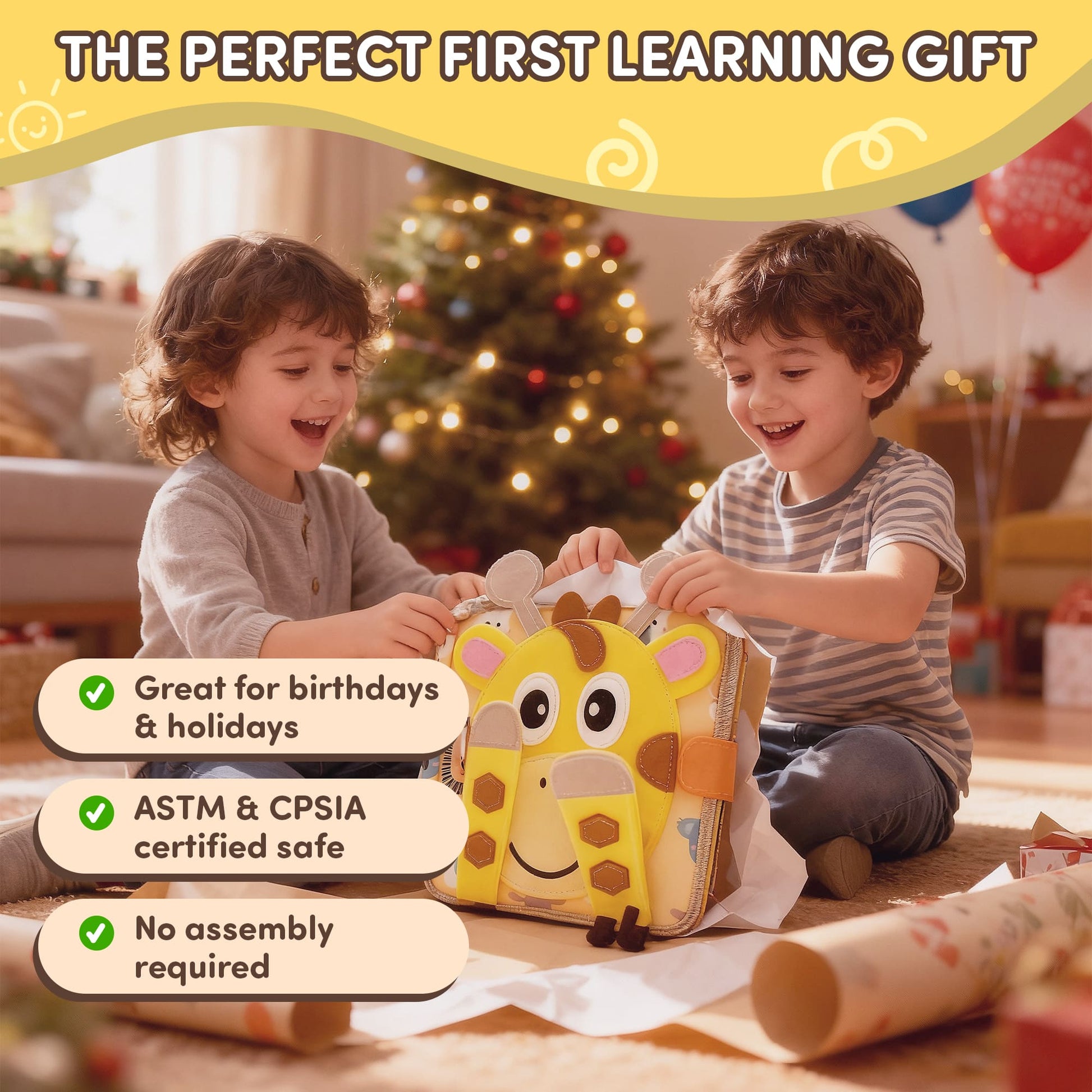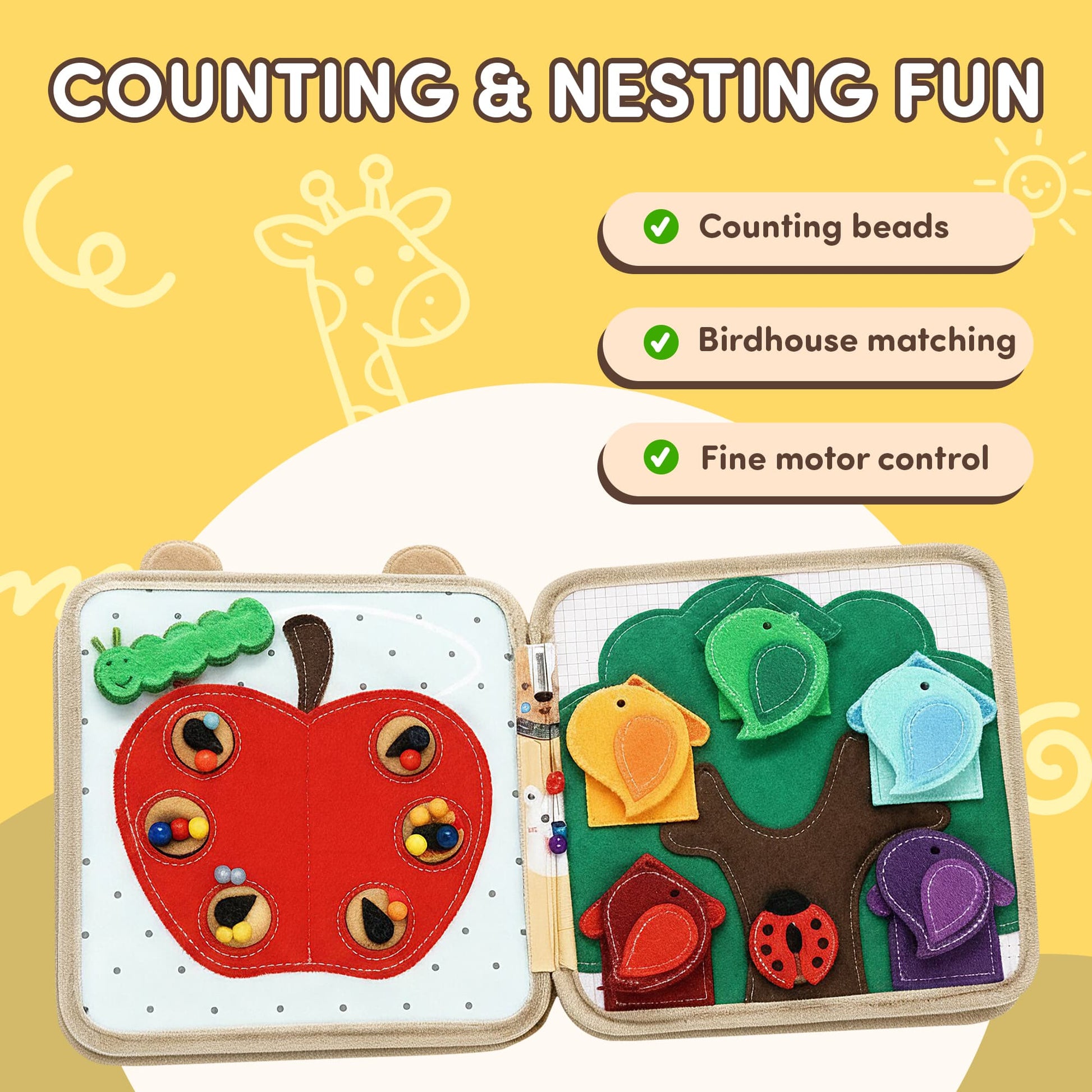The cute giraffe cover instantly captures attention and makes kids excited to explore what’s inside. Its soft felt design is inviting and safe, setting the stage for hours of playful learning.