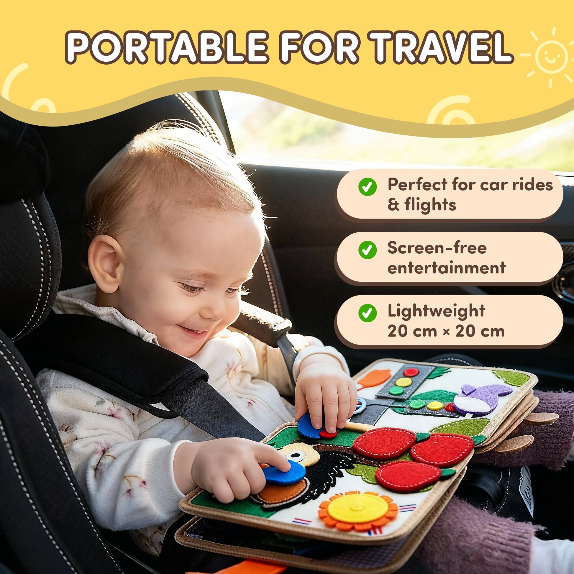 Yes. The book is lightweight (20 cm × 20 cm) and compact, making it easy to take on trips, car rides, or flights. It’s designed for quiet, screen-free play anywhere.