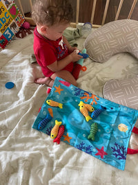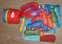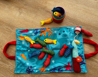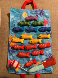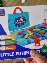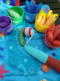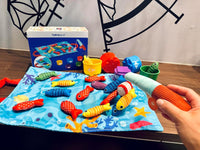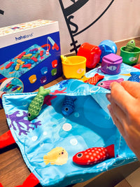 The set comes with 22 pieces, including colorful fish, numbered buckets, a fishing rod, and a foldable play mat that doubles as a carry bag.